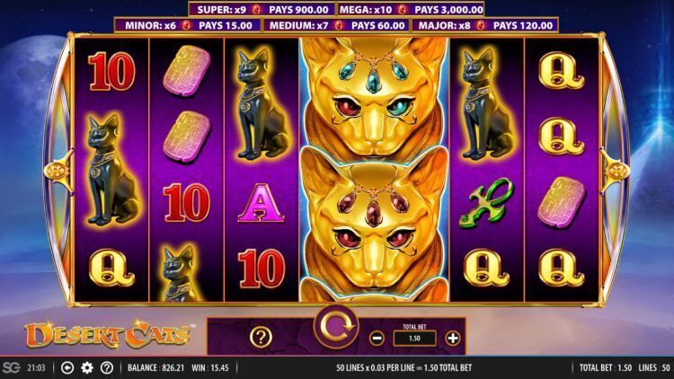 Desert Cats wordt gespeeld op 7 rollen met 4 rijen symbolen. Er zijn 50 vaste winlijnen, waarbij je met een bedrag van minimaal € 0,50 en maximaal € 100 speelt. Iedere draai worden 2 rollen volledig wild gemaakt, wat zorgt voor veel kleinere prijzen.