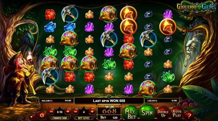 Het verhaal van de Giovanni’s Gems slot speelt zich af in een verborgen grot, diep in het bos, vol met kleurrijke edelstenen die naar beneden vallen als een waterval.