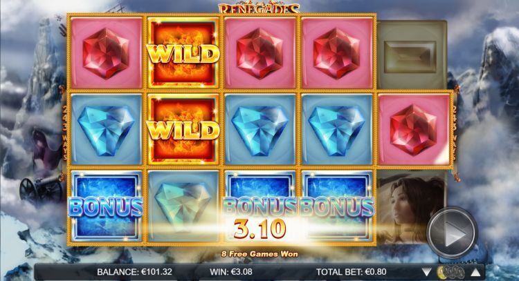 Het scatter symbool herken je door het blauwe plaatje met het woord bonus. Wanneer jij minimaal 3 van de scatter symbolen weet te draaien activeer je het Renegades Free Games bonusspel. Je krijgt dan 8 gratis spins. Voordat je de gratis spins kan draaien wordt er willekeurig één van de vijf Renagade symbolen geselecteerd.